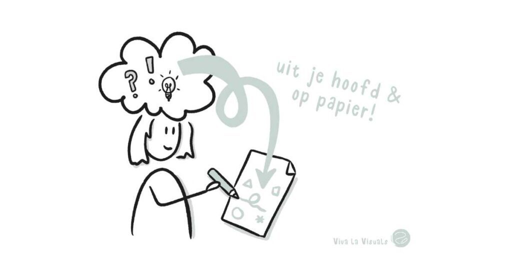 Ook kun je visuele aantekeningen maken voor jezelf. Van bijvoorbeeld bijeenkomsten, een training of lesstof. Dit worden ook wel ‘sketchnotes’ genoemd. Doordat je bij sketchnotes zowel tekent als schrijft, en tegelijk met inhoud bezig bent, gebruik je je beide hersenhelften. Dit zorgt ervoor dat je de stof beter onthoudt.