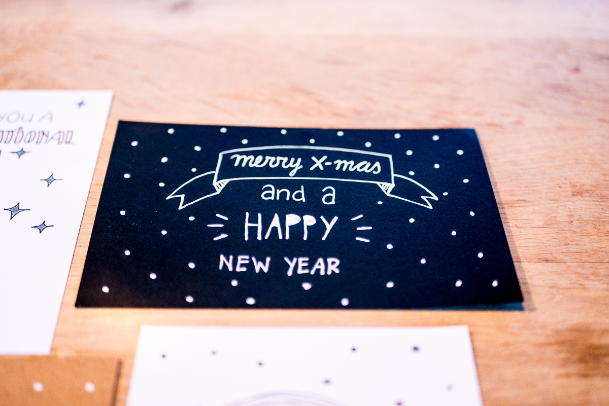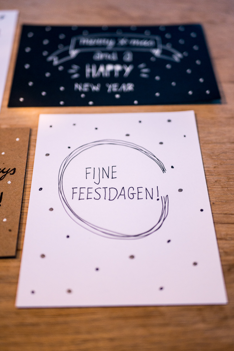 Ik heb mijn kaarten gemaakt op diverse kaarten van Boekenvoordeel. Zij hebben hele toffe witte, bruine en zwarte kaarten (ook verkrijgbaar bij de Pipoos). Ik heb diverse stiften gebruikt, maar was vooral fan van mijn nieuwe Edding lakmarker 780 (een krijtstift) op zwart papier. Super feestelijk!